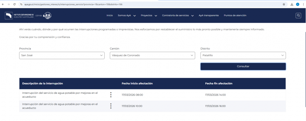 El AyA informa que el día de mañana 17 de marzo se suspenderá el servicio del agua de las 8:00am a 4:00pm por lo que se suspende la asistencia a clases presenciales. Los docentes estarán asignando trabajos para elaborar desde casa. Los estudiantes deben estar atentos.